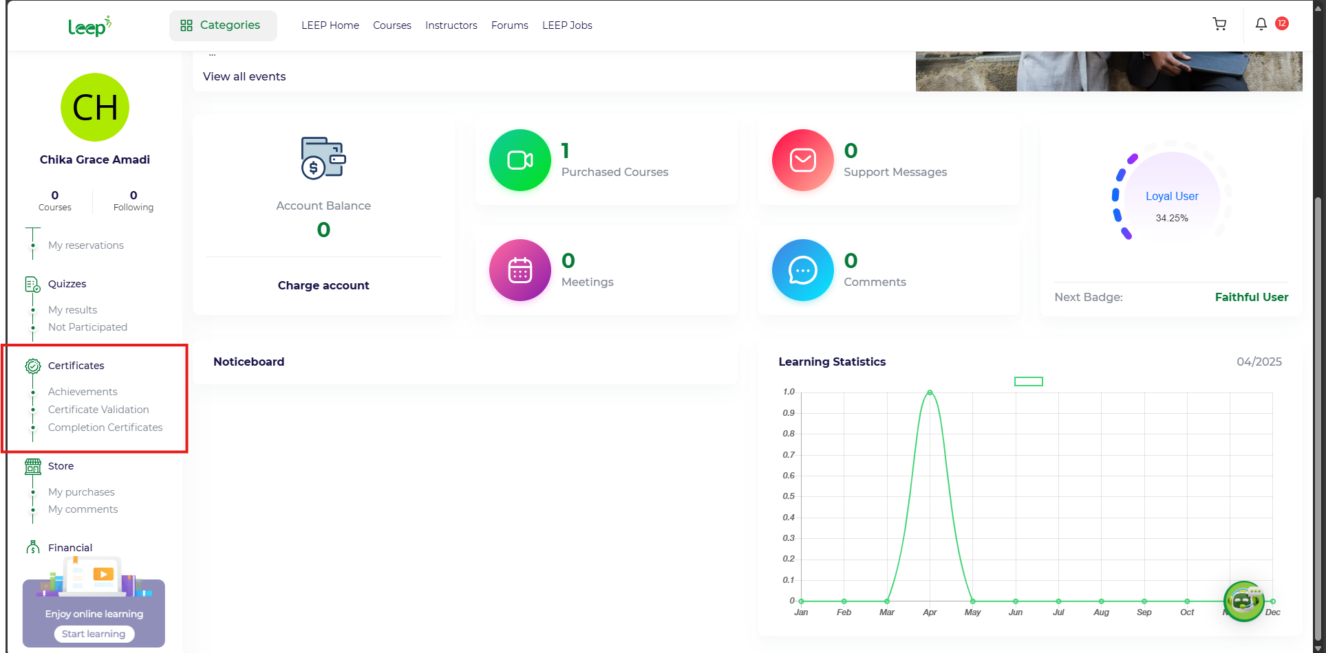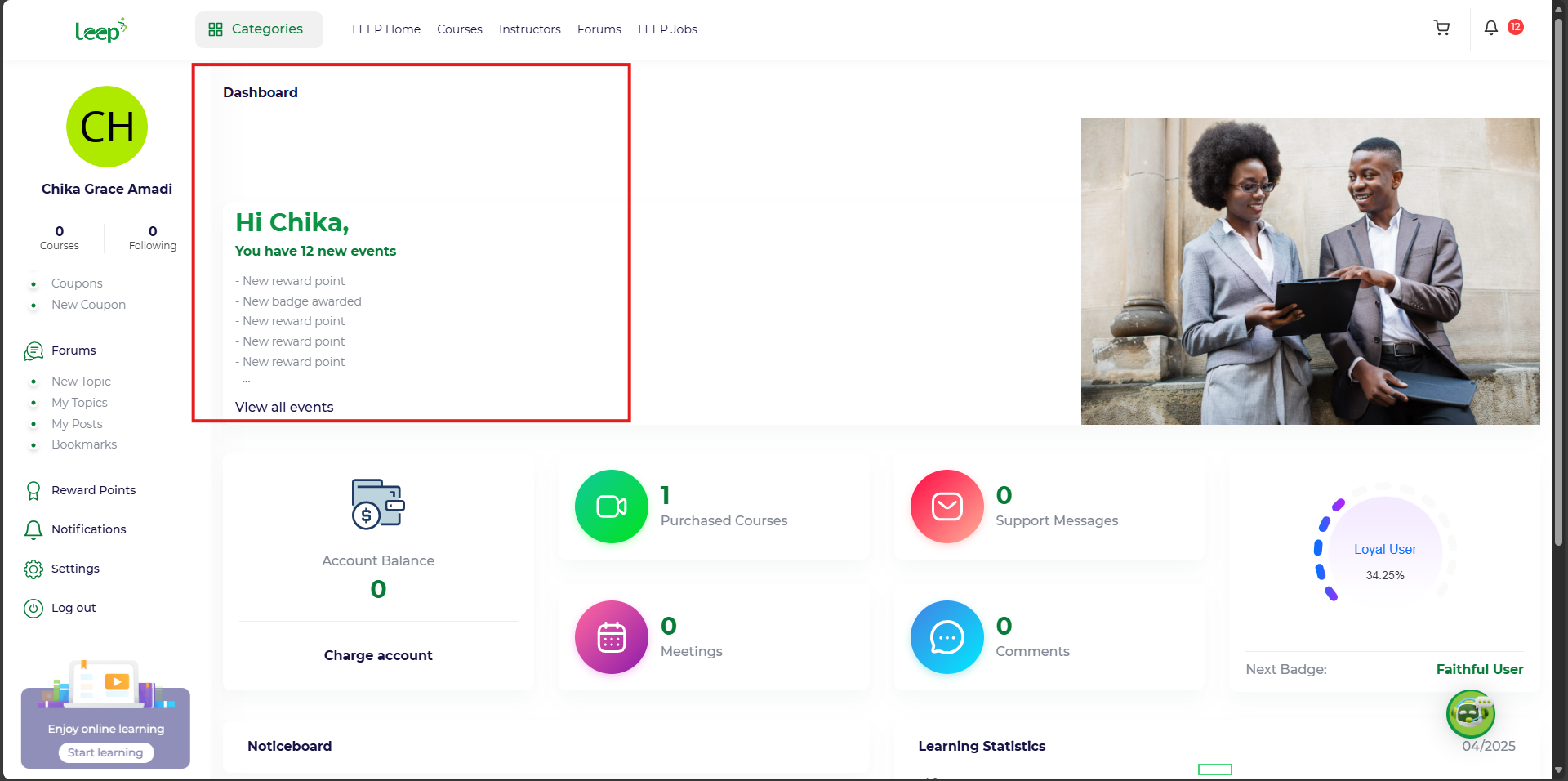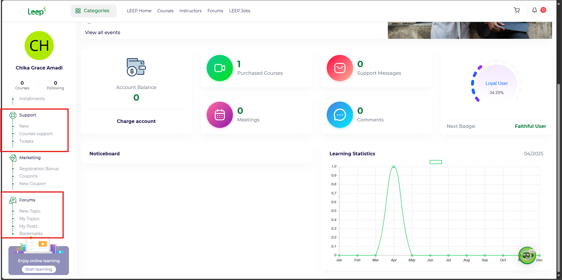 | 💰 Account Balance | Check how much credit you have for purchasing courses. THIS IS NOT APPLICABLE FOR THE LEEP DIGITAL ACADENY, AS ALL THE COURSES ARE FREE. |