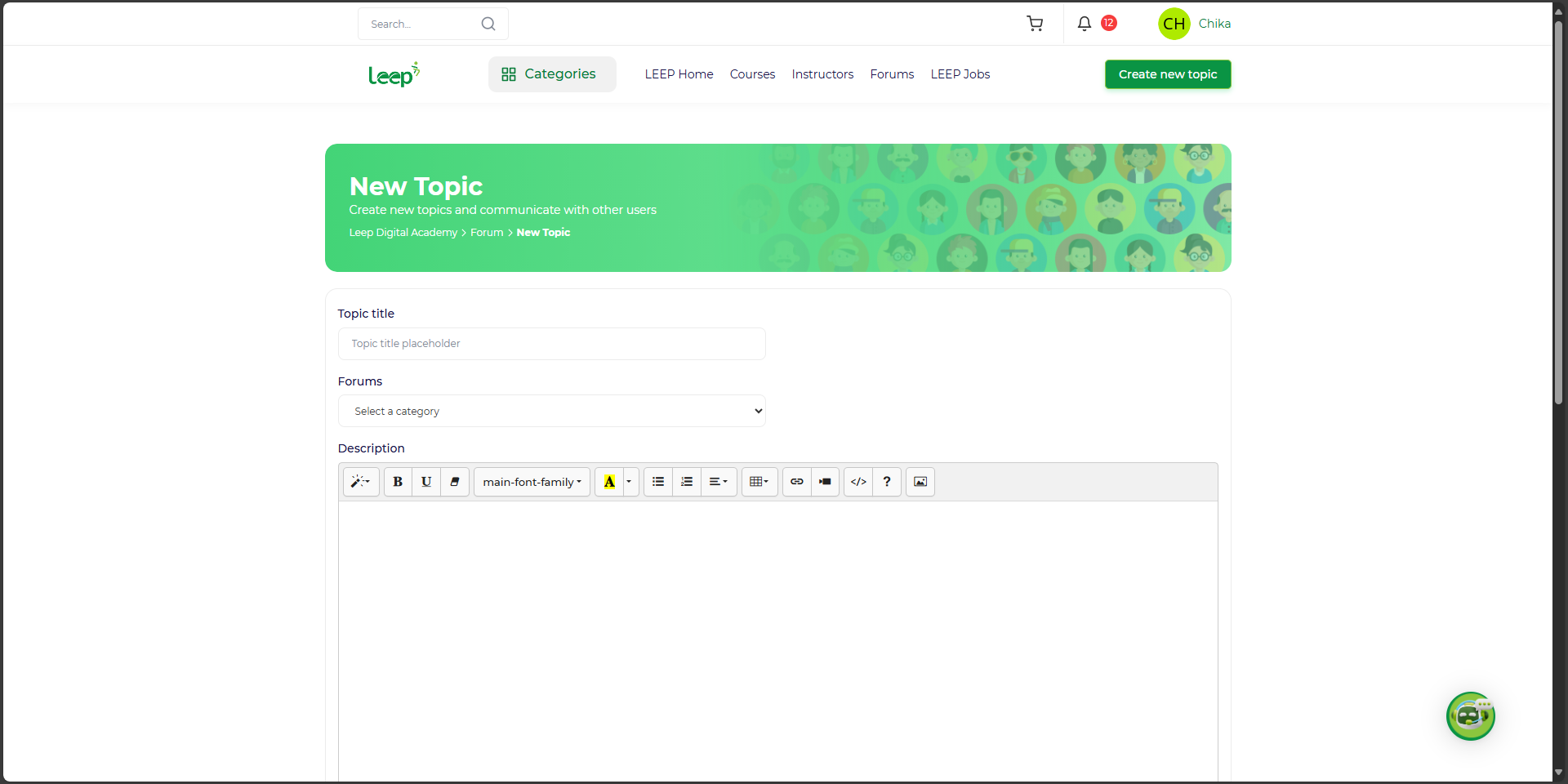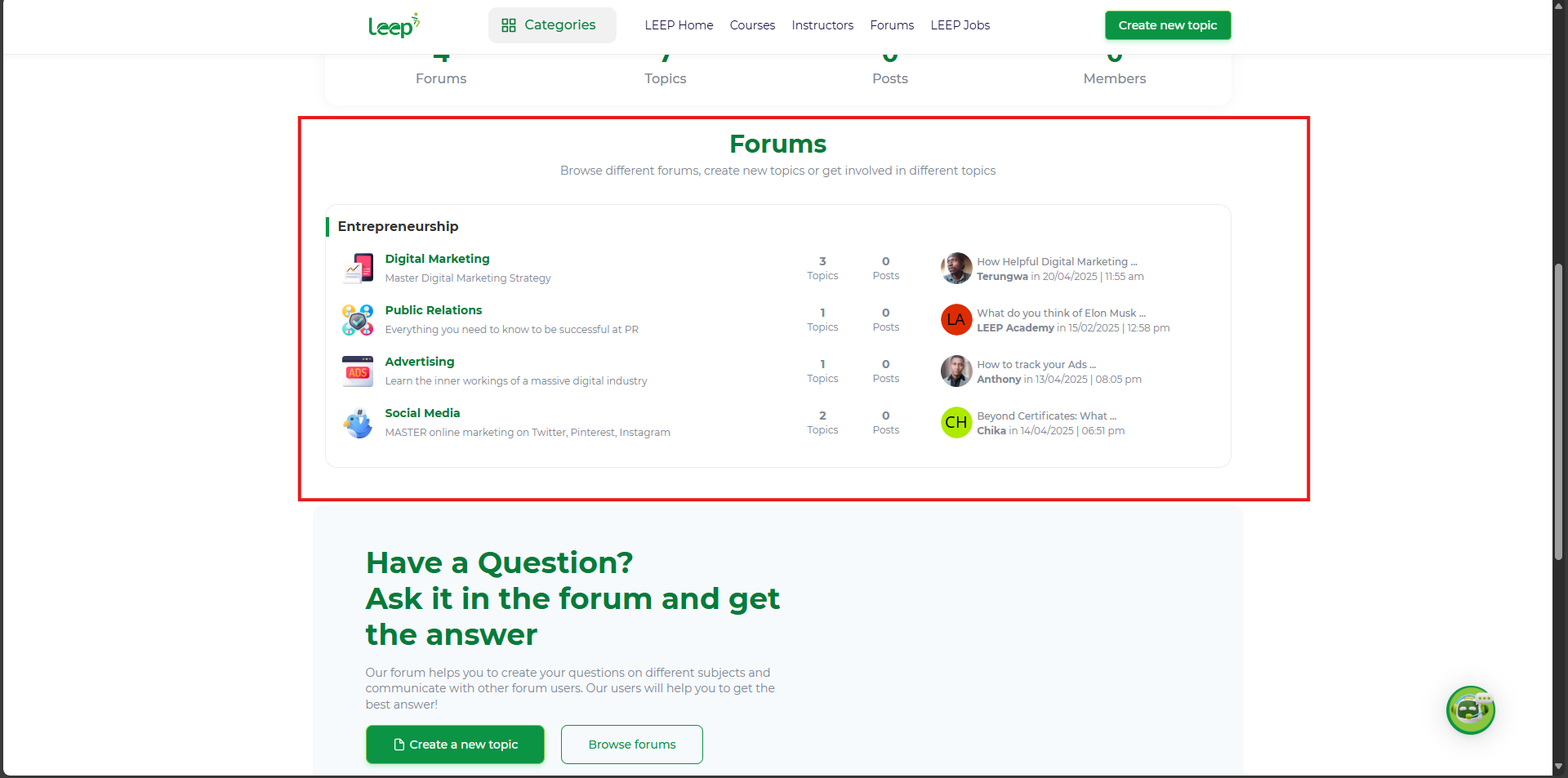 The LEEP Academy Forum is your go-to space to connect with fellow learners, ask questions, and get support from the community. Whether you're stuck on a course topic, looking for peer feedback, or just want to join a discussion, the forums are a powerful tool for collaboration.
