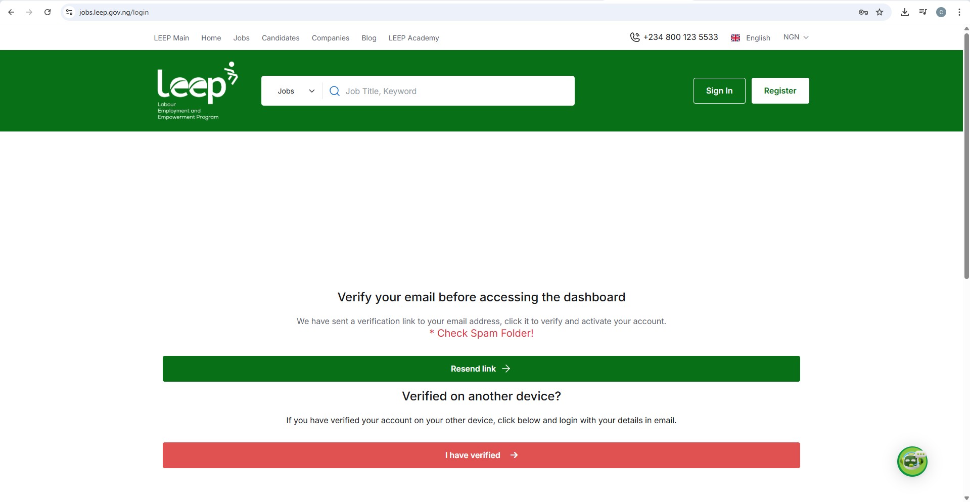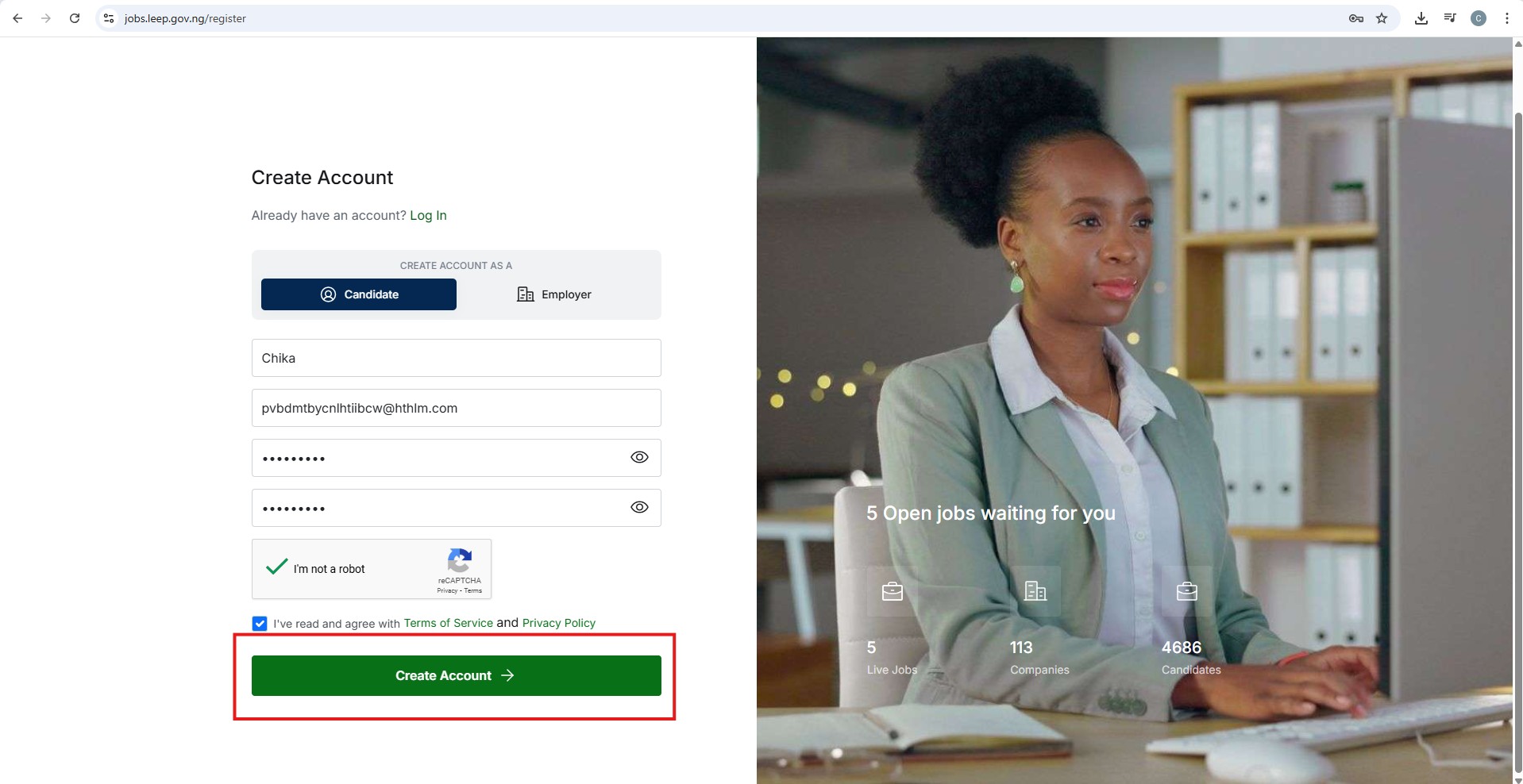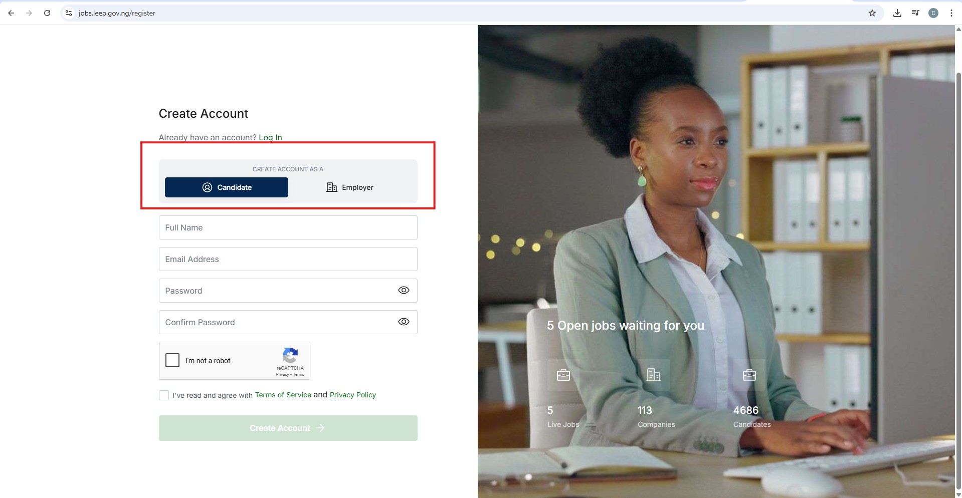 Go to jobs.leep.gov.ng/register to begin the sign-up process. You’ll see options to register as a Candidate (Job Seeker) or an Employer (Recruiter or Company).