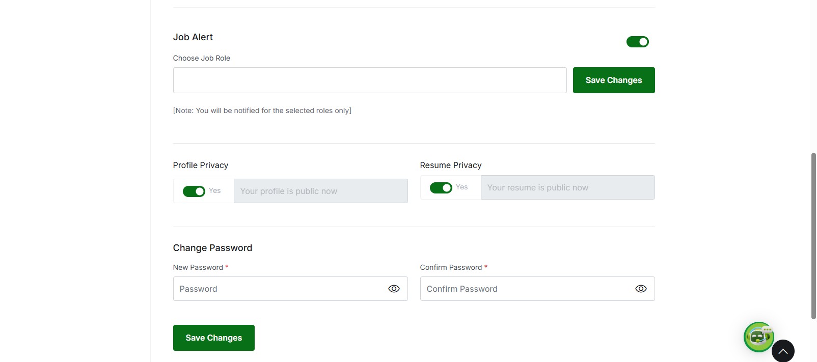 - Resume Privacy – Yes/No (Control resume visibility to employers)